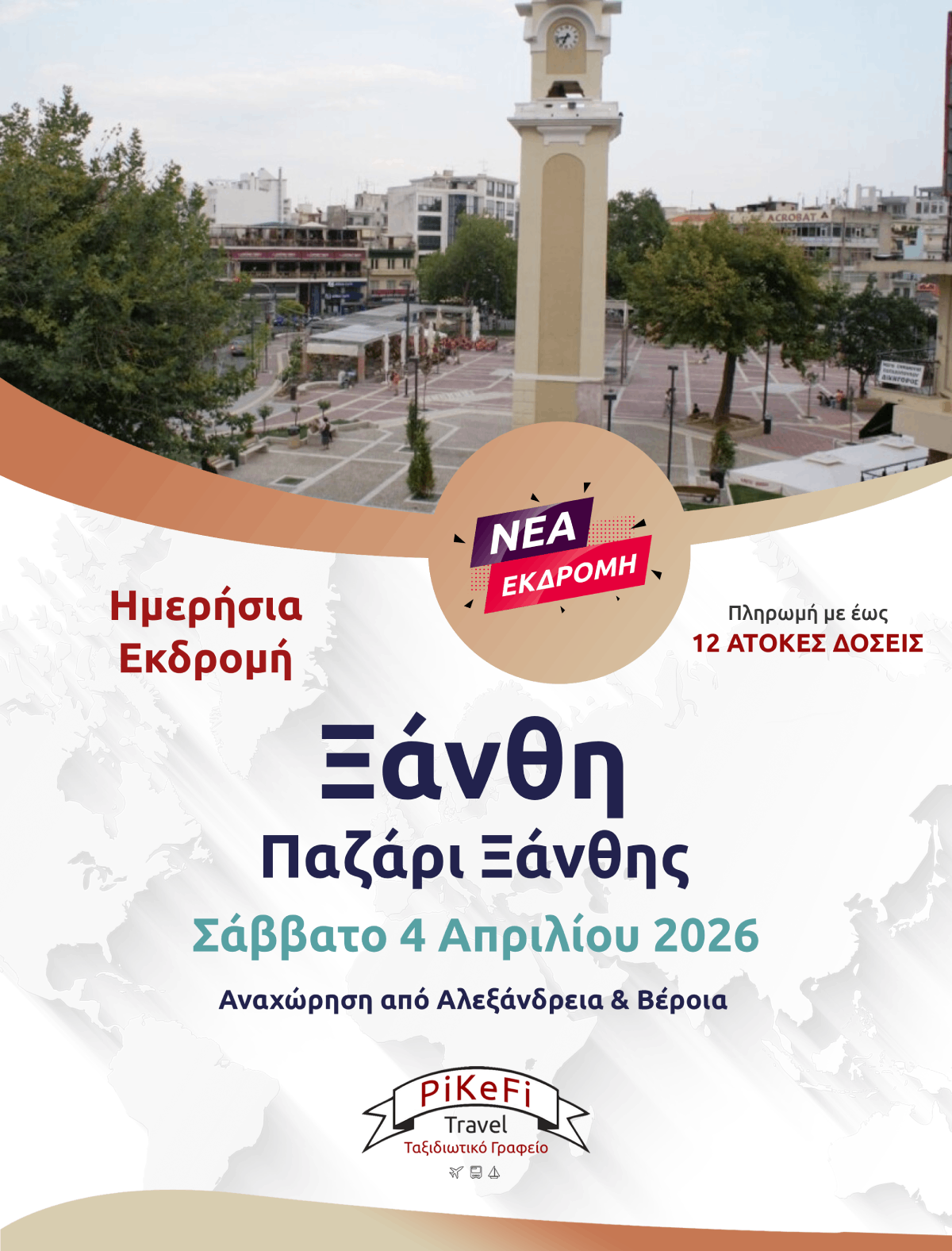 Το Σάββατο 4 Απριλίου αναχωρούμε από το γραφείο μας το πρωί, με την καλύτερη διάθεση και με τις απαραίτητες στάσεις φθάνουμε στην πανέμορφη πόλη της ΞΑΝΘΗΣ. Εκεί θα έχουμε ελεύθερο χρόνο για το διάσημο Παζάρι της πόλης, αλλά και να εξερευνήσει το μοναδικό σκηνικό της ρομαντικής ιστορίας της Παλιάς Πόλης, δημιούργημα του 19ου αιώνα, γεμάτη αρχοντικά με το δημαρχείο να στεγάζεται σε ένα καταπληκτικό παραδοσιακό κτίριο, το Λαογραφικό μουσείο με τοιχογραφίες σε κάθε τοίχο, την πινακοθήκη, και τις καπναποθήκες, τα αναπαλαιωμένα σπίτια των καπνεμπόρων και τους πλακόστρωτους δρόμους και φυσικά το φημισμένο παζάρι της.