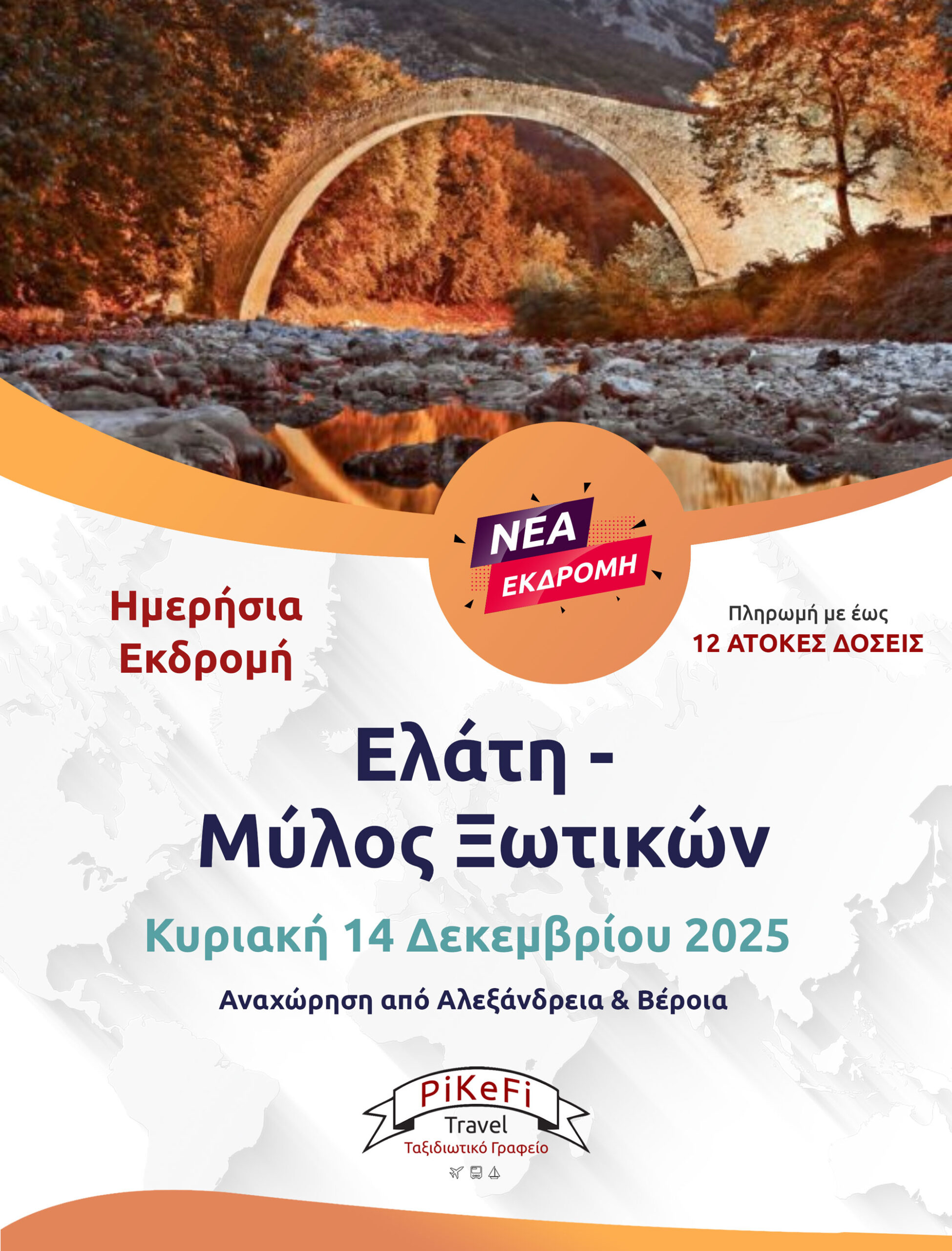 Την Κυριακή 14 Δεκεμβρίου θα ξεκινήσουμε με πρώτο μας προορισμό, το πανέμορφο παραδοσιακό χωριό Ελάτη. Ένα χωριό που έχει την φήμη της «Ελβετίας της Ελλάδος». Ανάμεσα στο δάσος με τα έλατα, ξεπροβάλουν πέτρινα σπίτια με μικρά καφέ και εστιατόρια με rustic ξύλινη επένδυση και πολύ καλό φαγητό. Εδώ θα γευματίσουμε και γεμάτοι θα συνεχίσουμε για τον επόμενο δημοφιλή προορισμό της ημέρας και φυσικά της Χριστουγεννιάτικης εποχής: Το μύλο των ξωτικών στα Τρίκαλα, όπου για φέτος το θέμα του είναι ο Πίτερ Παν και η Χώρα του Ποτέ!