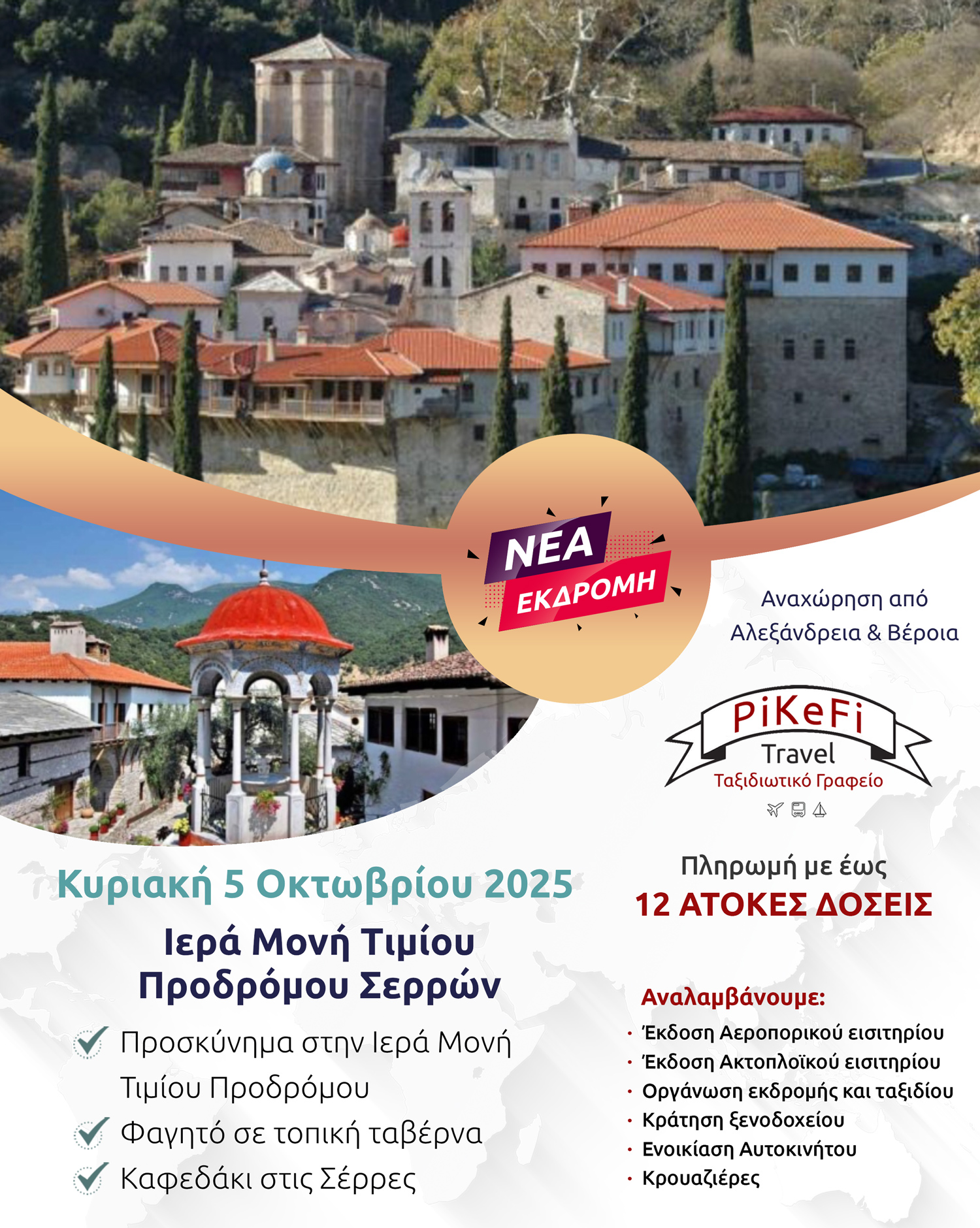 Την Κυριακή 5 Οκτωβρίου στο βάθος μιας κατάφυτης από κυπαρίσσια, πλατάνια και πεύκα, χαράδρας μας περιμένει η Μονή του Τιμίου Προδρόμου.