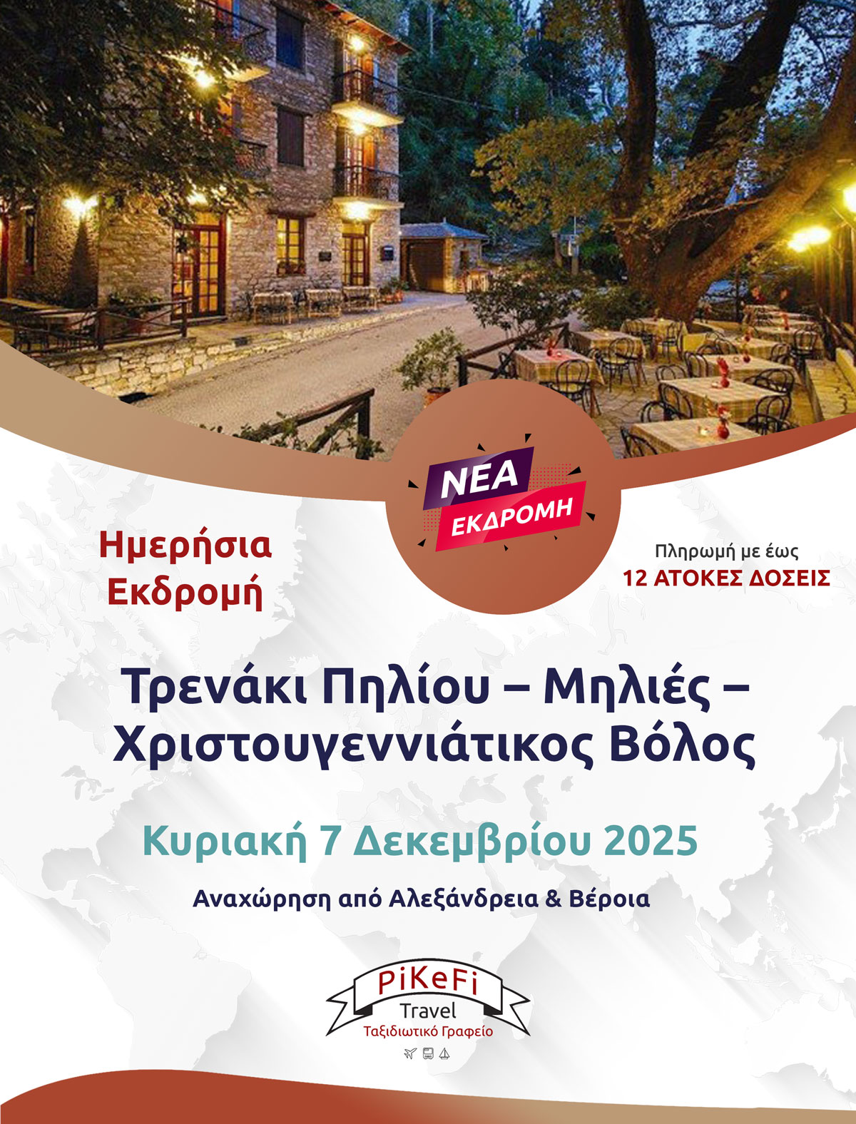 Γιορτάζοντας τον μήνα των Χριστουγέννων, αναχωρούμε το πρωί με την πιο γιορτινή μας διάθεση με προορισμό τα Άνω Λεχώνια στο Πήλιο για να πάρουμε στις 10 το πρωί, προαιρετικά το διάσημο τρενάκι του Πηλίου, τον θρυλικό “Μουτζούρη”, για μία μυθική διαδρομή στο βουνό των Κενταύρων, έως το χωριό Μηλιά.